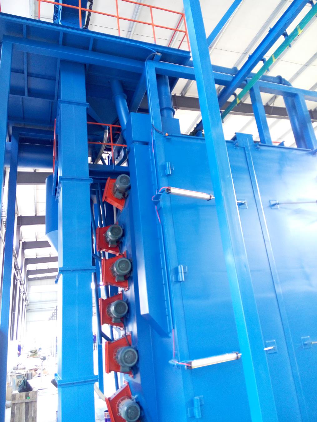 江苏专业抛丸机厂家生产的悬链通过式抛丸机适用于大批量的中小工件的抛丸处理。工件随吊链可连续运行、分步进运行、采用先进的积放推式悬链输送工件,使工件在加卸料和抛丸区分别处在停止的状态,实现了定点装卸和定点抛丸的工序工作,其中单钩吊重50~2000kg,并且它的生产率高,运行可靠,对于一些表面和内腔比较复杂的工件,如果发动机缸体缸盖、电机壳体等清理效果很好。本产品使用汽车、拖拉机、柴油机、电机、阀门等行业。